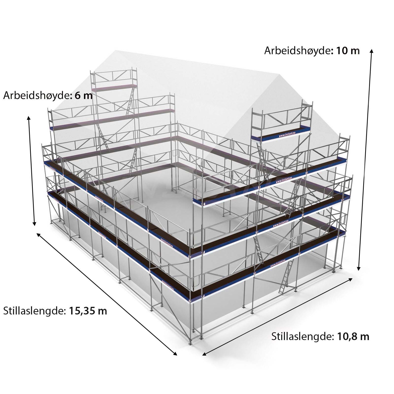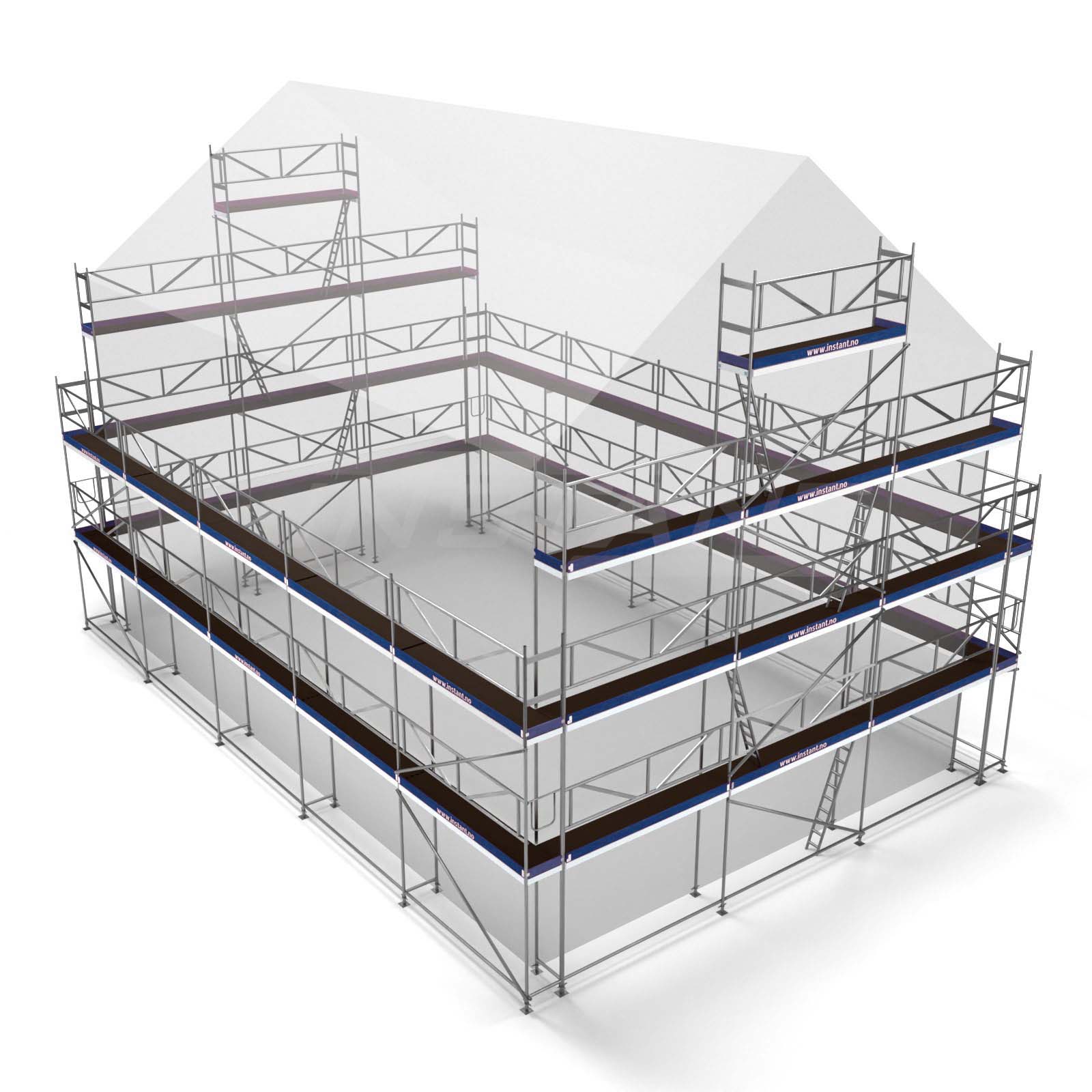 Master builder package for those who need scaffolding around larger buildings – typically detached houses/projects. With this package you can easily cover the gable walls and long sides. The scaffolding can also be mounted in other ways than in the picture, and it is possible to buy extra components for expanding the scaffolding. The scaffolding is complete and there is ladder access on all sides.